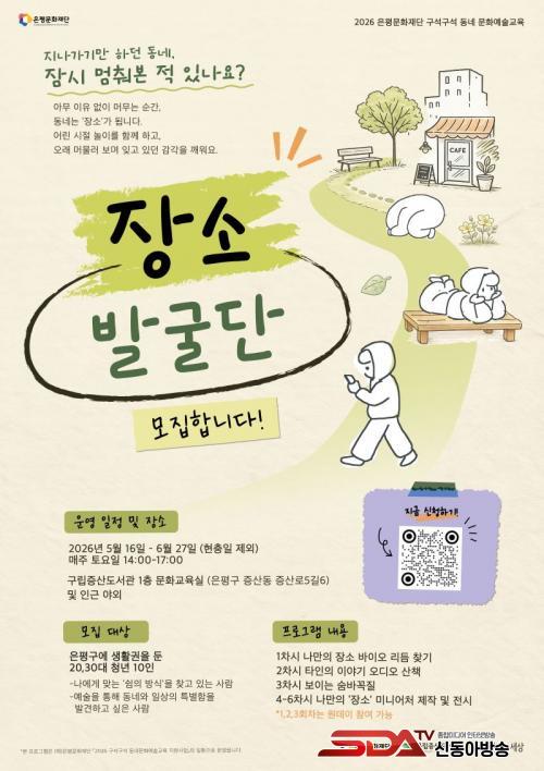 ¡®Àå¼Ò¹ß±¼´Ü¡¯ ÇÁ·Î±×·¥Àº ÀºÆò±¸ÀÇ °Å¸®¿Í °ñ¸ñÀ» Á÷Á¢ °ÉÀ¸¸ç ÀÏ»ó ¼Ó °ø°£À» »õ·Ó°Ô ¹Ù¶óº¸´Â Âü¿©Çü ¹®È¿¹¼ú ÇÁ·Î±×·¥ÀÌ´Ù. Âü¿©ÀÚ´Â °È±â¡¤¸Ó¹«¸£±â¡¤±â·ÏÇϱ⠵îÀÇ È°µ¿À» ÅëÇØ °¢ÀÚÀÇ ¼Óµµ·Î ÀڽŸ¸ÀÇ ¡®Àå¼Ò¡¯¸¦ ¹ß°ßÇÑ´Ù. ÀÌ °úÁ¤¿¡¼ ÀÚ¿¬½º·´°Ô ŸÀΰú ±³·ùÇϸç Áö¿ª°úÀÇ °ü°è¸¦ È®ÀåÇÏ°Ô µÈ´Ù.