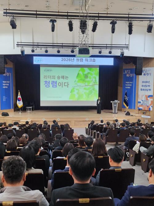 [½Åµ¿¾Æ¹æ¼Û=ÀÌÀçö±âÀÚ] È­¼ºÆ¯·Ê½Ã´Â 22ÀÏ ½Ãû ´ë°­´ç¿¡¼­ °íÀ§°øÁ÷ÀÚ¸¦ ´ë»óÀ¸·Î ¡®2026³â û·Å ¿öÅ©¼ó¡¯À» °³ÃÖÇß´Ù. À̹ø ¿öÅ©¼óÀº Á¶Á÷À» À̲ô´Â °íÀ§°øÁ÷ÀÚÀÇ Ã»·Å ¸®´õ½ÊÀ» °­È­Çϰí, ¹ÝºÎÆÐ °ü·Ã ¹ý·É¿¡ ´ëÇÑ ÀÌÇØ¸¦ ³ô¿© °øÁ¤Çϰí Åõ¸íÇÑ °øÁ÷¹®È­¸¦ Á¤Âø½ÃŰ¡¦