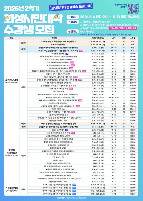 [½Åµ¿¾Æ¹æ¼Û=ÀÌÀçö±âÀÚ] È­¼ºÆ¯·Ê½Ã´Â 2026³â È­¼º½Ã¹Î´ëÇÐ 2Çб⠼ö°­»ýÀ» ¿À´Â 5¿ù 4ÀϺÎÅÍ 5¿ù 10ÀϱîÁö ¼±Âø¼øÀ¸·Î ¸ðÁýÇÑ´Ù°í ¹àÇû´Ù. È­¼º½Ã¹Î´ëÇÐÀº Èñ¸ÁÈ­¼ºÀÇ ¹Ì·¡¸¦ À̲ø Áö¼º°ú ÀμºÀ» °®Ãá ½Ã¹Î ÀÎÀ縦 ¾ç¼ºÇϱâ À§ÇÑ È­¼º½Ã ´ëÇ¥ Æò»ýÇнÀ ±³À°°úÁ¤À¸¡¦