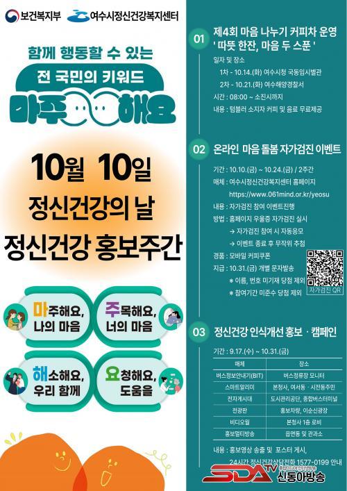 ¿©¼ö½Ã º¸°Ç¼Ò °ü°èÀÚ´Â ¡°Á¤½Å°Ç°Àº ´©±¸¿¡°Ô³ª Áß¿äÇÑ ¹®Á¦À̸ç ÇÔ²² ÁöÄÑ¾ß ÇÒ ºÎºÐ¡±À̶ó¸ç ¡°À̹ø È«º¸ÁÖ°£À» ÅëÇØ ½Ã¹ÎµéÀÌ ¸¶À½ °Ç°ÀÇ ¼ÒÁßÇÔÀ» µÇ»õ±â°í µµ¿òÀÌ ÇÊ¿äÇÒ ¶§ ÁÖÀúÇÏÁö ¾Ê°í »ó´ãÀ» ¿äûÇÒ ¼ö ÀÖ´Â »çȸ ºÐÀ§±â°¡ È®»êµÇ±æ ¹Ù¶õ´Ù¡±°í ¸»Çß´Ù.