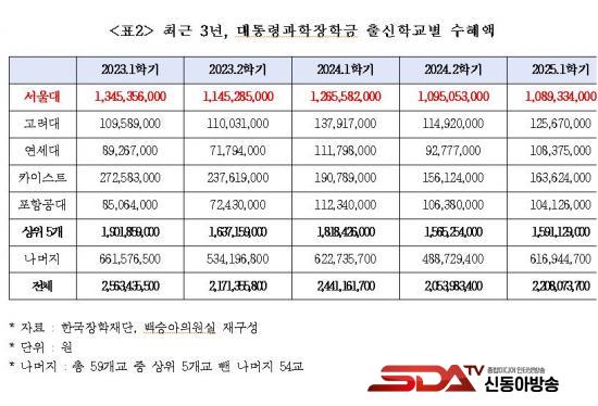 ¡à ±¹È¸ ±³À°À§¿øÈ¸ ¹é½Â¾Æ ÀÇ¿ø(´õºÒ¾î¹ÎÁÖ´ç)ÀÌ Çѱ¹ÀåÇÐÀç´ÜÀ¸·ÎºÎÅÍ Á¦Ãâ¹ÞÀº ¡®±¹°¡¿ì¼öÀåÇÐ±Ý ¼öÇý ÇöȲ¡¯ ÀÚ·á¿¡ µû¸£¸é, ¿ÃÇØ 1Çб⠴ëÅë·É°úÇÐÀåÇбÝÀ» ¹ÞÀº 397¸í Áß °ú¹ÝÀÎ 207¸í(52.1%)ÀÌ ¼¿ï´ë»ýÀ̾ú´Ù. ¼¿ï´ë ´ÙÀ½À¸·Î ¼öÇýÇлýÀÌ ¸¹Àº Ä«À̽ºÆ®(28¸í¡¤7.1%)º¸´Ù 179¸íÀ̳ª ¸¹¾Æ ¼¿ï´ë·ÎÀÇ ÀåÇÐ±Ý ¼öÇý ½ò¸²ÀÌ Å« °ÍÀ¸·Î ³ªÅ¸³µ´Ù.