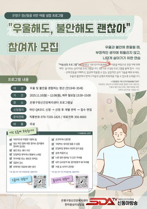 ±¸´Â ÀÓ»ó½ÇÇèÀ» ÅëÇØ È¿°ú¼ºÀÌ ÀÔÁõµÈ ¸¶À½ ì±èÀ» ±â¹ÝÇÑ ÀÎÁöÇൿġ·á(MBCT)¸¦ ÅëÇØ û³âµéÀÇ ¸¶À½À» µ¹º¸°íÀÚ ÇÑ´Ù. ÀÌ ÇÁ·Î±×·¥Àº ºÎÀûÀÀÀûÀÎ »ç°í¡¤Çൿ Á¶Àý ¹× ÀûÀÀÀûÀÎ ´ëóÀü·«À» ½ÀµæÇØ Ã»³âµéÀÇ ¿ì¿ï°¨ ¶Ç´Â ºÒ¾È°¨ÀÇ Áõ»óÀ» ¿ÏÈÇϰí Àç¹ß·üÀ» ³·Ãß´Â °ÍÀ» ¸ñÀûÀ¸·Î ÇÑ´Ù.