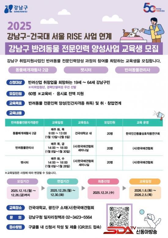 ±³À° °úÁ¤Àº µ¿¹°¸Å°³ÀçȰ»ç 2±Þ, ¹Ý·Áµ¿¹°°ü¸®»ç, Æê½ÃÅÍ µî 3°³ °úÁ¤ÀÌ´Ù. ±³À° ´ë»óÀº ¸¸ 19¼¼ ÀÌ»ó 64¼¼ ÀÌÇÏ °­³²±¸ °ÅÁÖÀÚÀ̸ç, °¢ °úÁ¤´ç 20¸í¾¿ ÃÑ 60¸íÀ» ¼±¹ßÇÑ´Ù. ±³À°Àº °Ç±¹´ëÇб³°¡ ¸Ã°í, ¼­¿ïÇü ¶óÀÌÁî(RISE) »ç¾÷°ú ¿¬°èÇØ ÁøÇàÇÑ´Ù.