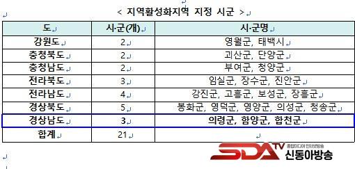 ±¹ÅäºÎ¿¡¼´Â ¼ºÀåÃËÁøÁö¿ª(³«ÈÄÁö¿ª)À¸·Î ÁöÁ¤µÈ ½Ã±ºÀÇ 30% ¹üÀ§ ³»¿¡¼ Áö¿ªÈ°¼ºÈÁö¿ªÀ» ÁöÁ¤Çϵµ·Ï Çϰí ÀÖÀ¸¸ç °æ³²µµ´Â 11°³ ½Ã±º*ÀÌ ¼ºÀåÃËÁøÁö¿ªÀ¸·Î ÁöÁ¤µÇ¾î ÀÖ´Ù.