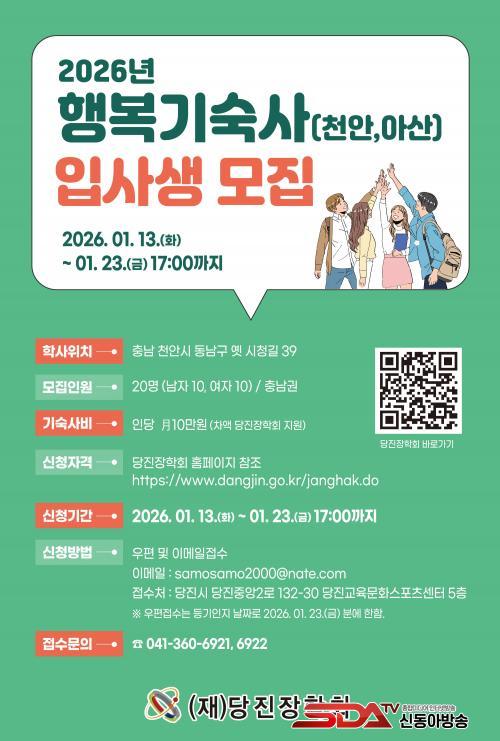 [½Åµ¿¾Æ¹æ¼Û=ÀÌÀçö±âÀÚ] ´çÁø½Ã´Â Ãæ³²¿¡ ÀÖ´Â ´ëÇÐÀ» ´Ù´Ï´Â ´çÁø½Ã ´ëÇлýÀ» ´ë»óÀ¸·Î 2026³â õ¾È Çູ±â¼÷»ç(µ¿³²±¸ ¼ÒÀç) ÀÔ»ç»ý 20¸íÀ» ¸ðÁýÇÑ´Ù°í 14ÀÏ ¹àÇû´Ù.