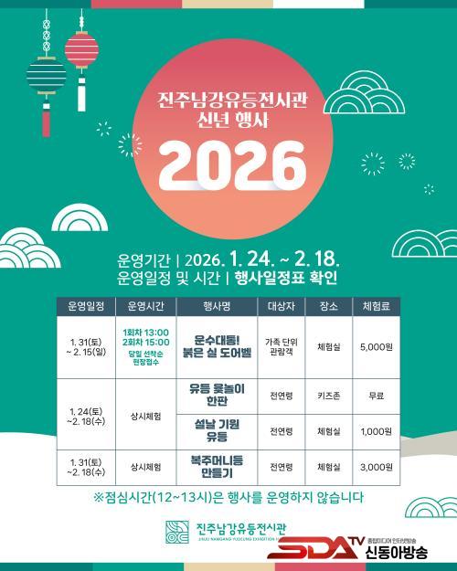 Çà»ç ±â°£ µ¿¾È Àü½Ã°ü¿¡¼´Â »õÇØÀÇ º¹°ú ¼Ò¸ÁÀ» ±â¿øÇϴ üÇèÀÌ ¿î¿µµÈ´Ù. ÁÖ¿ä ÇÁ·Î±×·¥À¸·Î´Â ¡ã¾×¿îÀ» ÂѰí Çà¿îÀ» ±â¿øÇϴ¡®¿î¼ö´ëÅë! ºÓÀº ½ÇÀÇ µµ¾îº§ ¸¸µé±â¡¯ ¡ãÁ÷Á¢ ¸¸µç À·À¸·Î °¡Á·°ú ÇÔ²² Áñ±æ ¼ö Àִ¡®À¯µî À·³îÀÌ ÇÑÆÇ¡¯ ¡ãº¹À» ±â¿øÇÏ´Â ¡®º¹ÁÖ¸Ó´Ï µî ¸¸µé±â¡¯ ¡ã2026³â ÇÑ ÇØÀÇ ¼Ò¸ÁÀ» ´ã¾Æ À¯µî¿¡ ºÒÀ» ¹àÈ÷´Â ¡®¼³³¯ ±â¿ø À¯µî ¸¸µé±â¡¯µîÀÌ ¸¶·ÃµÅ ÀÖ´Ù.