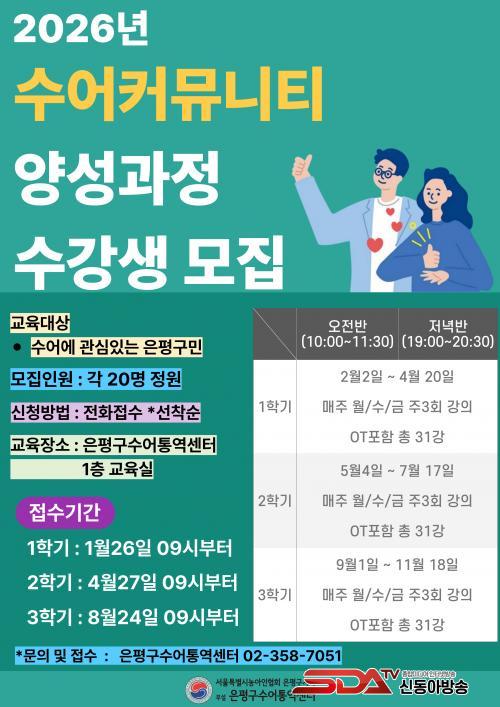 À̹ø °úÁ¤Àº Áõ»êµ¿¿¡ À§Ä¡ÇÑ ÀºÆò±¸¼ö¾îÅ뿪¼¾ÅÍ¿¡¼ ¹«·á·Î ¿î¿µµÈ´Ù. 1Çб⠰úÁ¤Àº ³»´Þ 2ÀϺÎÅÍ 4¿ù 20ÀϱîÁö ¸ÅÁÖ ¿ù¡¤¼ö¡¤±Ý¿äÀÏ ÁÖ 3ȸ ÁøÇàµÈ´Ù. ¿ÀÀü¹ÝÀº ¿ÀÀü 10½ÃºÎÅÍ 11½Ã 30ºÐ±îÁö, Àú³á¹ÝÀº ¿ÀÈÄ 7½ÃºÎÅÍ 8½Ã 30ºÐ±îÁö ¿î¿µµÉ ¿¹Á¤ÀÌ´Ù.