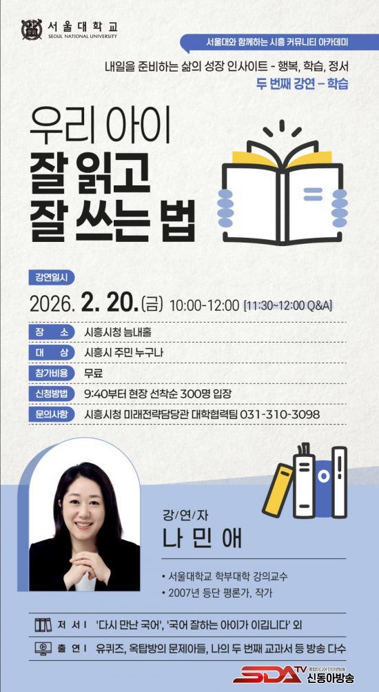 »ó¹Ý±â¿¡´Â ¼¿ï´ëÇб³ ±³¼öÁøÀÌ Âü¿©ÇÏ´Â ½Ã¹Î ´ë»ó °¿¬ ÇÁ·Î±×·¥ ¡®½ÃÈï Ä¿¹Â´ÏƼ ¾ÆÄ«µ¥¹Ì¡¯¸¦ 1¿ùºÎÅÍ 5¿ù±îÁö ÃÑ 5ȸ(¿ù 1ȸ) ¿î¿µÇÑ´Ù. °¿¬Àº ¼¿ï´ëÇб³ ½ÃÈïÄ·ÆÛ½º ÄÁº¥¼ÇȦ°ú ½Ãû ´Æ³»È¦¿¡¼ ÁøÇàµÇ¸ç, ½ÃÈï½Ã¹ÎÀº ´©±¸³ª Âü¿©ÇÒ ¼ö ÀÖ´Ù. 2¿ù 20ÀÏ ¿ÀÀü 10½Ã¿¡´Â ½Ãû ´Æ³»È¦¿¡¼ ³ª¹Î¾Ö ¼¿ï´ëÇб³ ±³¼öÀÇ °¿¬ ¡®¿ì¸® ¾ÆÀÌ Àß Àаí Àß ¾²´Â ¹ý¡¯ÀÌ ÁøÇàµÈ´Ù.