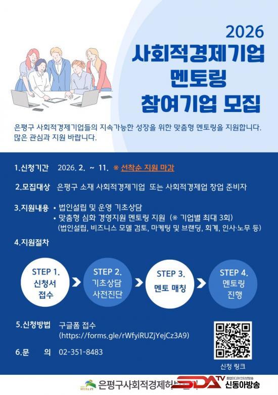 [½Åµ¿¾Æ¹æ¼Û ÀºÆò±¸=À̽ŵ¿±âÀÚ] ¼­¿ï ÀºÆò±¸´Â °ü³» »çȸÀû°æÁ¦±â¾÷ÀÇ °æ¿µ ¿ª·® °­È­¸¦ À§ÇØ ¡®2026³â »çȸÀû°æÁ¦±â¾÷ ¸ÂÃãÇü ¸àÅ丵 »ç¾÷¡¯À» ¿î¿µÇϰí, Âü¿© ±â¾÷À» ¸ðÁýÇÑ´Ù°í ¹àÇû´Ù.