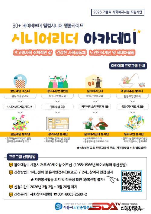 ¸ðÁý ´ë»óÀº ½ÃÈï½Ã¿¡ °ÅÁÖÇÏ´Â 60¼¼ ÀÌ»ó ¾î¸£½ÅÀ̸ç, ƯÈ÷ 1955³âºÎÅÍ 1963³â »çÀÌ¿¡ Ãâ»ýÇÑ º£À̺ñºÎ¸Ó ¼¼´ë¸¦ ¿ì¼± ¼±¹ßÇÑ´Ù. ÃÑ 10¸íÀ» ¼±¹ßÇϸç, ¸ðÁý ±â°£Àº 3¿ù 20ÀϱîÁö´Ù. ½ÅûÀº ½ÃÈï½Ã³ëÀÎÁ¾ÇÕº¹Áö°ü »çȸÂü¿©ÆÀ(031-404-3100)¿¡ ÀüÈÇØ¼ Çϰųª È«º¸¹°ÀÇ Á¤º¸¹«´Ì(Å¥¾ËÄÚµå)¸¦ ÅëÇØ¼µµ ÇÒ ¼ö ÀÖ´Ù. ÃÖÁ¾ Âü¿©ÀÚ´Â ÀÚ¿øºÀ»ç Ȱµ¿¿¡ ´ëÇÑ Àû±Ø¼º°ú Âü¿© ÀÇÁö¸¦ Áß½ÉÀ¸·Î ½É»ç¸¦ °ÅÃÄ ¼±¹ßµÈ´Ù.