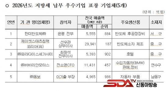 ¿ì¼ö±â¾÷À¸·Î ¼±Á¤µÈ ±â¾÷Àº ±¹³» ¸ÅÃâ »óÀ§ 1õ´ë ±â¾÷ Áß ÀÎõ¿¡ ¼ÒÀçÇÑ Áö¹æ¼¼ ³³ºÎ¾× 3¾ï ¿ø ÀÌ»ó ±â¾÷À¸·Î, ÀÎõ»ó°øÈ¸ÀǼÒÀÇ ÃßõÀ» ¹Þ¾Æ ¼±Á¤µÈ 5°³ ±â¾÷ÀÌ´Ù. ÀÌµé ±â¾÷Àº 2024³â ¸ÅÃâ¾× ±âÁØ ±¹³» 1õ ´ë ±â¾÷ Áß ÀÎõ¿¡ ¼ÒÀçÇÑ ±â¾÷µé·Î, Áö¹æ¼¼ ³³ºÎ ¿ì¼ö±â¾÷À¸·Î¼­ Áö¿ª°æÁ¦ Ȱ¼ºÈ­¿¡ ±â¿©ÇÑ °ø·Î¸¦ ÀÎÁ¤¹Þ¾Ò´Ù.