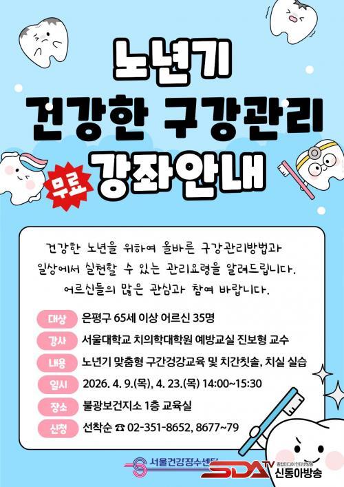 °¿¬Àº ´ÙÀ½ ´Þ 9Àϰú 23ÀÏ ¿ÀÈÄ 2½Ã, ºÒ±¤º¸°ÇÁö¼Ò 1Ãþ ±³À°½Ç¿¡¼ ÁøÇàµÈ´Ù. Áøº¸Çü ¼¿ï´ëÇб³ Ä¡ÀÇÇдëÇпø ±³¼ö°¡ ³ë³â±â ±¸° °ü¸®ÀÇ Á߿伺°ú ½Ç»ýȰ¿¡¼ ½ÇõÇÒ ¼ö ÀÖ´Â °ü¸® ¹æ¹ýÀ» °ÀÇÇϸç, Ä¡°£Ä©¼Ö°ú Ä¡½Ç »ç¿ë¹ý üÇè ±³À°µµ ÇÔ²² ÁøÇàµÈ´Ù.