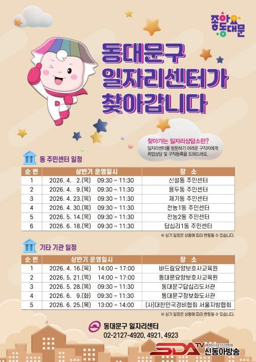 »ó¹Ý±â ã¾Æ°¡´Â ÀÏÀÚ¸®»ó´ã¼Ò´Â 4¿ù 2ÀϺÎÅÍ 6¿ù 25ÀϱîÁö ¿î¿µµÈ´Ù. ½Å¼³µ¿, ¿ëµÎµ¿, Á¦±âµ¿, Àü³ó1¡¤2µ¿, ´ä½Ê¸®1µ¿ µî 6°³ µ¿ Áֹμ¾Å͸¦ ºñ·ÔÇØ Á÷¾÷ÈÆ·Ã±â°ü°ú µµ¼°ü(µ¿´ë¹®±¸Á¤º¸Èµµ¼°ü, µ¿´ë¹®±¸´ä½Ê¸®µµ¼°ü)±îÁö ¿î¿µ Àå¼Ò¸¦ È®´ëÇØ Á¢±Ù¼ºÀ» ³ô¿´´Ù.