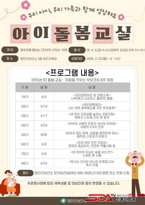 ¸ðÁý ´ë»óÀº ¿µÀ¯¾Æ±â ¾Æµ¿À» µ¹º¸´Â ÇԾȱº °ÅÁÖ ºÎ¸ð ¹× Á¶ºÎ¸ð 15¸íÀ¸·Î, ¼±Âø¼ø ¸ðÁýÇϸç 4¿ù 1ÀϱîÁö ½ÅûÇÒ ¼ö ÀÖ´Ù. ±³À°Àº ¿À´Â 4¿ù 3ÀϺÎÅÍ 5¿ù 22ÀϱîÁö 2°³¿ù°£ ¸ÅÁÖ ±Ý¿äÀÏ ¿ÀÈÄ 2½Ã¿¡ ÇԾȱºº¸°Ç¼Ò 3Ãþ º¸°Ç±³À°Àå¿¡¼ ÁøÇàµÈ´Ù.
