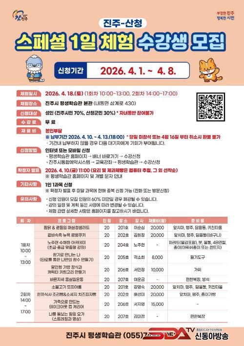 [½Åµ¿¾Æ¹æ¼Û °æ³²ÁøÁÖ=³²±Ã¿µ±â±âÀÚ] ÁøÁֽà Æò»ýÇнÀ°üÀº 4¿ù 1ÀϺÎÅÍ 8ÀϱîÁö ¡®ÁøÁÖ-»êû ½ºÆä¼È 1ÀÏ Ã¼Ç衯 ÇÁ·Î±×·¥ ¼ö°­»ýÀ» ¸ðÁýÇÑ´Ù.