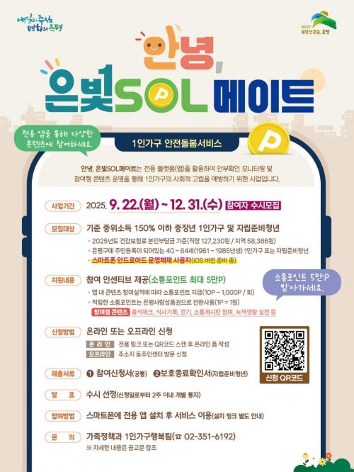 [½Åµ¿¾Æ¹æ¼Û ÀºÆò±¸=À̽ŵ¿±âÀÚ] ¼­¿ï ÀºÆò±¸´Â Áö³­ 22ÀϺÎÅÍ 1ÀÎ °¡±¸ ¾ÈÀüµ¹º½¼­ºñ½º ¡®¾È³ç, ÀººûSOL¸ÞÀÌÆ®¡¯ Âü¿©ÀÚ ¸ðÁýÀ» ½ÃÀÛÇß´Ù°í ¹àÇû´Ù. À̹ø »ç¾÷Àº Àü±¹ ÃÖÃÊ·Î ¾ÛÀ» ±â¹ÝÀ¸·Î ÇÑ ¾ÈºÎ È®Àΰú Âü¿©Çü ÄÜÅÙÃ÷ µîÀ» Á¦°øÇØ Áõ°¡ÇÏ´Â 1ÀÎ °¡±¸ÀÇ »çȸÀû ¡¦