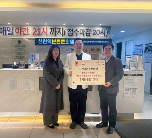 [½Åµ¿¾Æ¹æ¼Û ½ÃÈï½Ã=À̽ŵ¿±âÀÚ] ½Åõ¿ªº»Æ°Æ°ÀÇ¿øÀº Áö³­ 12¿ù 9ÀÏ ½Åõµ¿ ÇàÁ¤º¹Áö¼¾ÅÍ¿¡ ÈÞÁö 30·Ñ, 100°³¸¦ Àü´ÞÇϸç ÀÌ¿ô »ç¶ûÀ» ½ÇõÇß´Ù. Àü´Þ½Ä¿¡´Â º»Æ°Æ°ÀÇ¿ø ¿øÁ¾Âù ´ëÇ¥¿øÀå°ú ½Åȭö ½Åõµ¿ÀåÀÌ Âü¼®ÇßÀ¸¸ç, ÈÄ¿ø ¹°Ç°Àº ½ÃÈï½Ã1%º¹ÁöÀç´Ü ±âŹÀ» ÅëÇØ¡¦