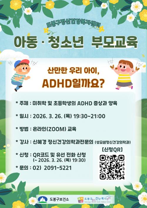 [½Åµ¿¾Æ¹æ¼Û µµºÀ±¸=À̽ŵ¿±âÀÚ] ¼­¿ï µµºÀ±¸°¡ ¿À´Â 3¿ù 26ÀÏ ¿ÀÈÄ 7½Ã 30ºÐ¿¡ ¾Æµ¿¡¤Ã»¼Ò³â±â ´ëÇ¥ Á¤½ÅÁúȯÀÎ ÁÖÀǷ°áÇÌ °úÀ×ÇൿÀå¾Ö(ADHD)¿¡ ´ëÇÑ ºÎ¸ð ±³À°À» ½Ç½ÃÇÑ´Ù. ±³À°Àº ¿Â¶óÀÎ(ZOOM)À¸·Î ÁøÇàµÇ¸ç, ¡ãÁÖÀÇ·Â °áÇÌ ¹× °úÀ× ÇൿÀå¾ÖÀÇ Áõ»ó ¡ãÆò°¡ °úÁ¤¡¦