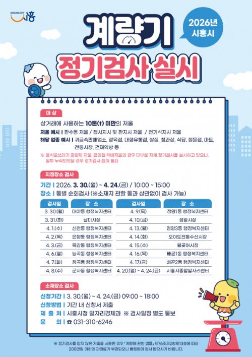 [½Åµ¿¾Æ¹æ¼Û ½ÃÈï½Ã=À̽ŵ¿±âÀÚ] ½ÃÈï½Ã´Â °øÁ¤ÇÑ »ó°Å·¡ Áú¼­ È®¸³°ú ¼ÒºñÀÚ ±ÇÀÍ º¸È£¸¦ À§ÇØ ¿À´Â 3¿ù 30ÀϺÎÅÍ 4¿ù 24ÀϱîÁö ¡®2026³â °è·®±â(Àú¿ï) Á¤±â °Ë»ç¡¯¸¦ ½Ç½ÃÇÑ´Ù. À̹ø Á¤±â °Ë»ç´Â ¡®°è·®¿¡ °üÇÑ ¹ý·ü¡¯¿¡ µû¶ó 2³â¸¶´Ù ½ÃÇàµÇ´Â ¹ýÁ¤ °Ë»ç·Î, »ó°Å·¡¡¦