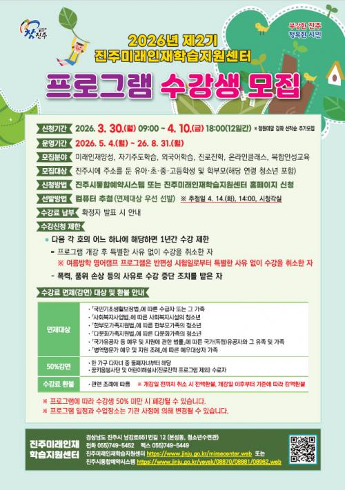 [½Åµ¿¾Æ¹æ¼Û °æ³²ÁøÁÖ=³²±Ã¿µ±â±âÀÚ] ÁøÁ̷ֹ¡ÀÎÀçÇнÀÁö¿ø¼¾ÅÍ´Â 3¿ù 30ÀϺÎÅÍ 4¿ù 10ÀϱîÁö ¡®2026³â Á¦2±â ÇÁ·Î±×·¥¡¯ ¼ö°­»ýÀ» ÁøÁֽà ÅëÇÕ¿¹¾à½Ã½ºÅÛ°ú ¹Ì·¡ÀÎÀç¼¾ÅÍ ´©¸®ÁýÀ» ÅëÇØ ¸ðÁýÇÑ´Ù. ¸ðÁý ºÐ¾ß´Â ¡ã¹Ì·¡ÀÎÀç ¾ç¼º ¡ãÀÚ±âÁÖµµÇнÀ ¡ã¿Ü±¹¾î ÇнÀ ¡ãÁø·Î¡¦
