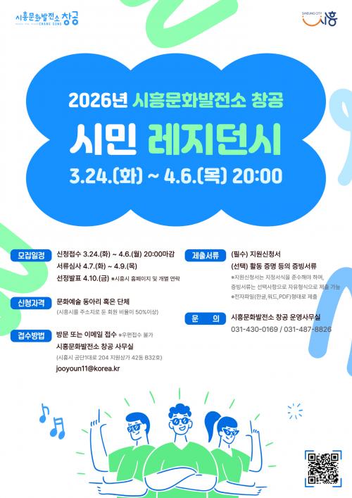 [½Åµ¿¾Æ¹æ¼Û ½ÃÈï½Ã=À̽ŵ¿±âÀÚ] ½ÃÈï½Ã´Â ½ÃÈ﹮ȭ¹ßÀü¼Ò â°ø¿¡¼­ 2026³â ½Ã¹Î ·¹Áö´ø½Ã¿¡ Âü¿©ÇÒ ¹®È­¿¹¼ú µ¿¾Æ¸® ¹× ´Üü¸¦ 4¿ù 6ÀϱîÁö ¸ðÁýÇÑ´Ù°í ¹àÇû´Ù. ½ÃÈ﹮ȭ¹ßÀü¼Ò â°øÀº ½ÃÈ­°ø±¸»ó°¡ ³» À§Ä¡ÇÑ »ýȰ¹ÐÂøÇü º¹ÇÕ¹®È­°ø°£À¸·Î, ½Ã¹Î ´©±¸³ª ÀÏ»ó ¼Ó¿¡¼­¡¦