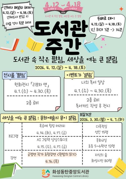 [½Åµ¿¾Æ¹æ¼Û=ÀÌÀçö±âÀÚ] È­¼ºµ¿ÅºÁß¾Óµµ¼­°üÀº Áö³­ÇØ 11¿ù 3ÀÏ °³°ü ÀÌÈÄ Ã³À½ ¸ÂÀÌÇÏ´Â µµ¼­°üÁÖ°£À» ±â³äÇØ ½Ã¹ÎµéÀÌ ´Ù¾çÇÑ µ¶¼­¡¤¹®È­»ýȰÀ» Áñ±æ ¼ö ÀÖµµ·Ï µµ¼­°üÁÖ°£ Ưº° ÇÁ·Î±×·¥À» ¿î¿µÇÑ´Ù°í ¹àÇû´Ù. À̹ø µµ¼­°üÁÖ°£ ÇÁ·Î±×·¥Àº ¾Æµ¿°ú ¼ºÀÎÀ» ´ë»óÀ¸¡¦