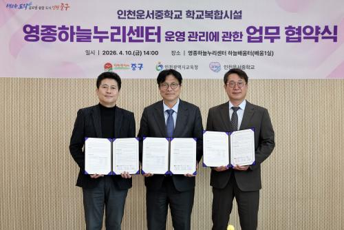 [½Åµ¿¾Æ¹æ¼Û ÀÎõ=À±¹Î½Ä±âÀÚ]¿µÁ¾±¸ Ãâ¹ü ¿ø³âÀ» ¸Â¾Æ ¿ÃÇØ »õ·Ó°Ô °³°üÇÑ ¡®¿µÁ¾Çϴô©¸®¼¾ÅÍ¡¯ÀÇ ¾ÈÁ¤Àû¡¤Ã¼°èÀû ¿î¿µÀ» À§ÇØ ÀÎõ½Ã Áß±¸°¡ ÀÎõ½Ã ±³À°Ã», ¿î¼­ÁßÇб³¿Í ¼ÕÀ» ¸ÂÀâ¾Ò´Ù. ±èÁ¤Çå ÀÎõ Áß±¸Ã»Àå°ú µµ¼ºÈÆ ÀÎõ½Ã ±³À°°¨, ±è¼º¿À ¿î¼­ÁßÇб³ÀåÀº 1¡¦